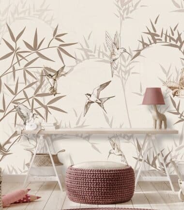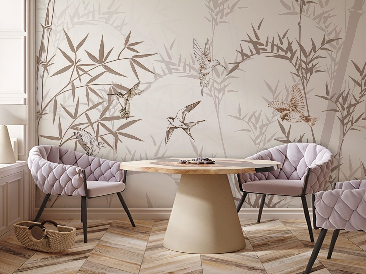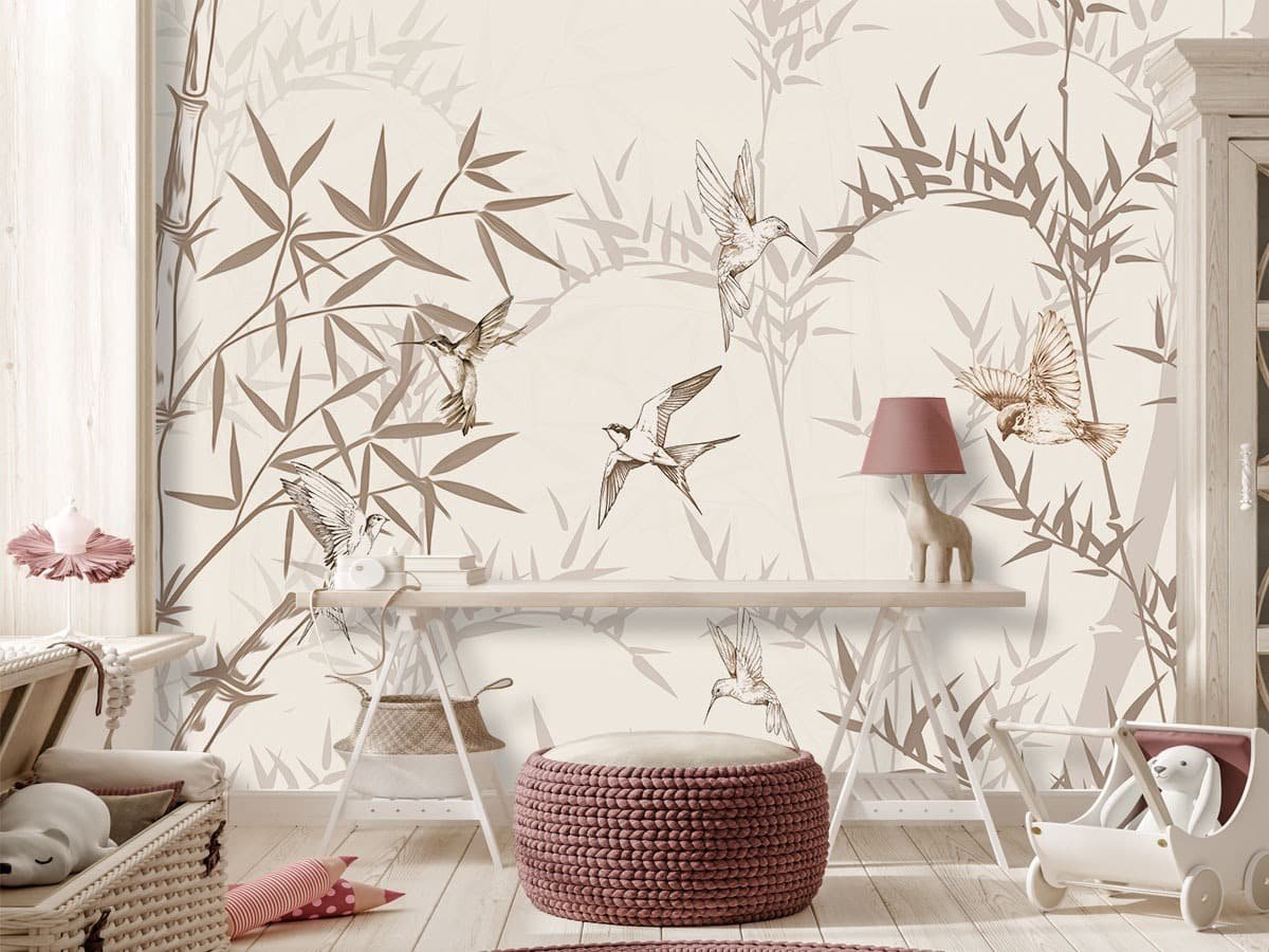 Bring calm elegance and handcrafted charm to your interiors with this embroidery-inspired botanical bird wallpaper. Designed to resemble delicate stitched artwork, the wallpaper features graceful birds in flight intertwined with fine bamboo branches, creating a soft, artistic, and sophisticated wall statement.