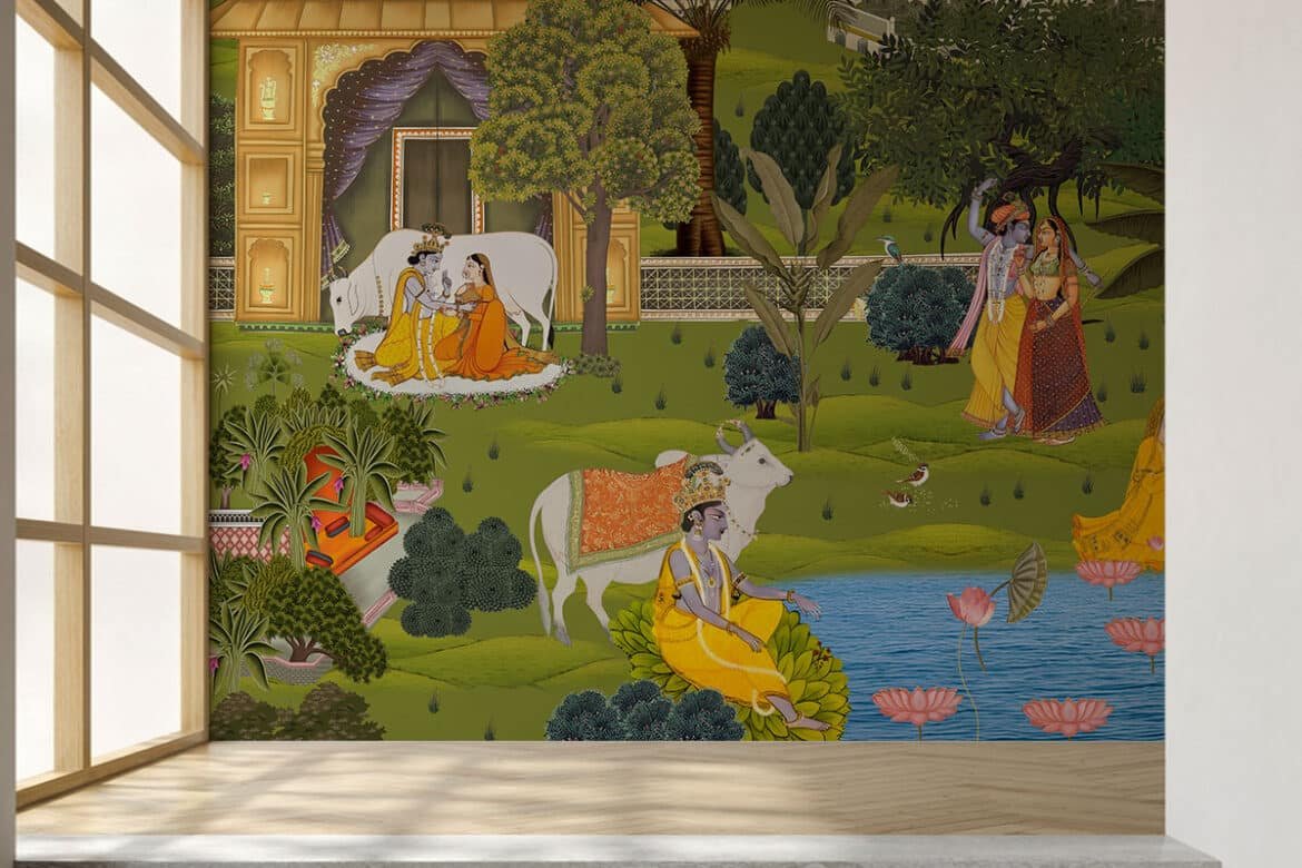 Verver, pichwai art wallpapers out elegance and timeless beauty for any spacecraft for commercial places such as living rooms, bedrooms, beans or even commercial places such as hotels and cafes.